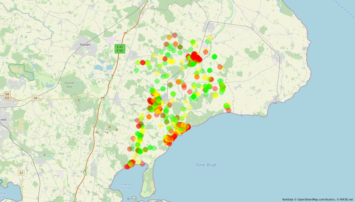 Kortet viser hvor boligerne er placeret. De grønne cirkler viser boliger der er til salg og hvor m² prisen ligger i den